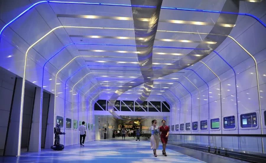 另一个思路则是将展览自然而然地融入旅客行程中,使观赏过程更加便捷有趣。广州白云机场与广东省博物馆合作,共同建设了一条长达两百米的“海天走廊”,是T1航站楼国际到达区与地铁间的通道,在场景设计上颇费心思。分为“古”“今”“未”三部分的海天走廊依次包含由金属方块组成的虚拟岭南建筑群、定期更换展览的文博馆、仿真古代船舱、著名商船“哥德堡号”的模型、飞机舷窗样式的展示柜,旅客一路走来便可以直观感知海上丝绸之路的历史文化气息。同时,走廊整体场景以蓝天白云为主,在镜面反射中展现海天一色的美景,上方贯穿着以不同材质和形状制作的“丝带”装置,每处细节都在与海上丝绸之路的主题遥相呼应。别出心裁的场景设计营造了沉浸式的氛围,丰富旅客观展体验。