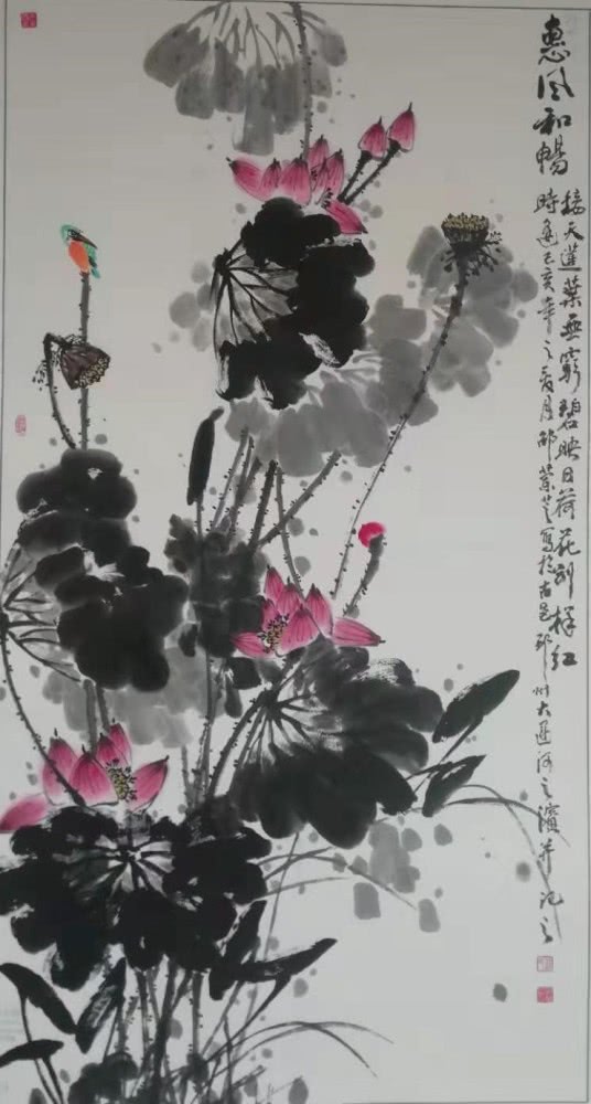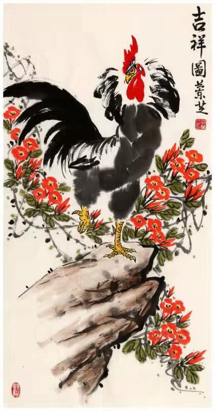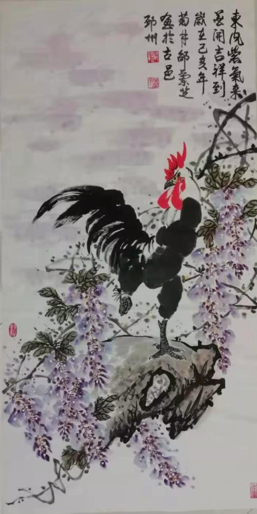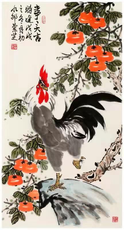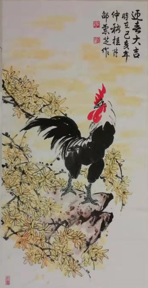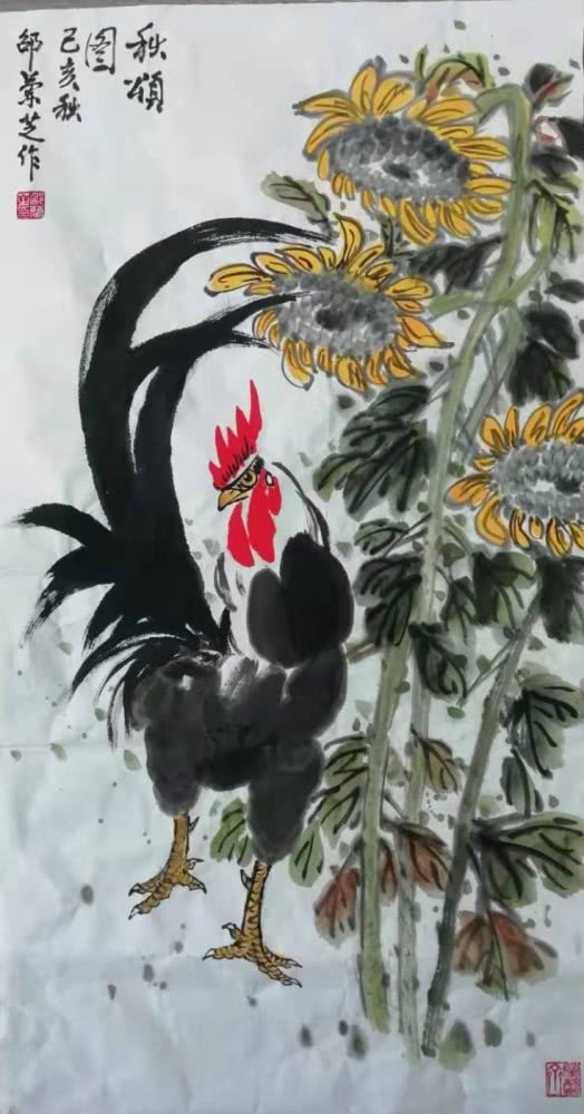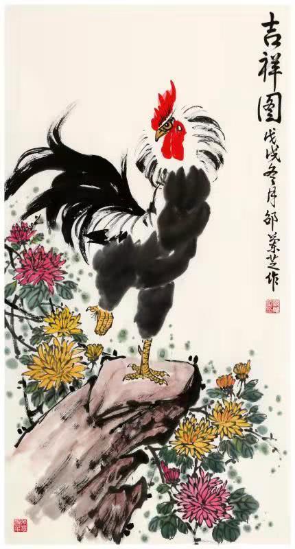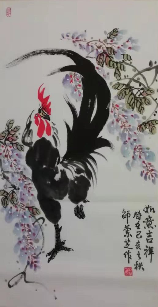零基础的邵老师启蒙于老年大学书画培训班,得益多为名家悉心指教,后又经邳州第一位中美协会员、原邳州美协主席李金友老师 磨礲淬励。影响邳州画坛近半个世纪的李老给予学习花鸟画的系统思路,闲玩也要法上循古。通过数载临摹研悟古今名作,师法前人笔墨构成,精进不休,风骨渐呈。邵老师擅长画牡丹、紫藤、公鸡、仙鹤等花鸟题材,设色明丽干净,线条婉转轻盈。作品呈现出清新淡雅文人气,活泼可爱生活气,简洁明快时尚气。在她五色笔墨勾勒出的点线结构中传递着一股如沐春风的艺术气息。