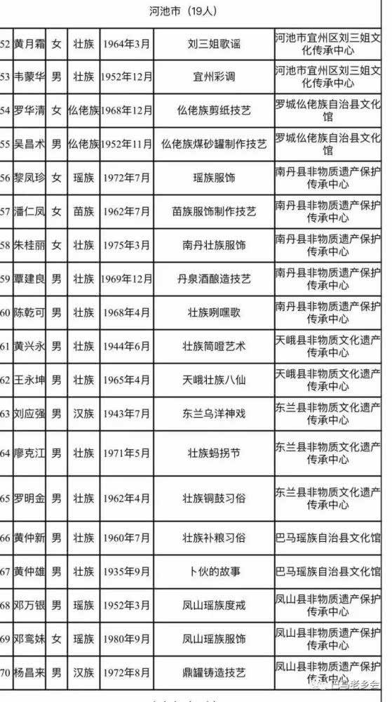 我市此次入选的非遗传承人来自宜州、罗城、南丹、天峨、东兰、巴马、凤山等县(区),项目包括刘三姐歌谣、彩调、剪纸技艺、煤砂罐制作技艺、民族服饰制作技艺、酿酒技艺、咧嘿歌、筒噔艺术、八仙、乌洋神戏、蚂拐节、铜鼓习俗、补粮习俗、卜伙的故事、度戒、鼎罐铸造技艺等。
