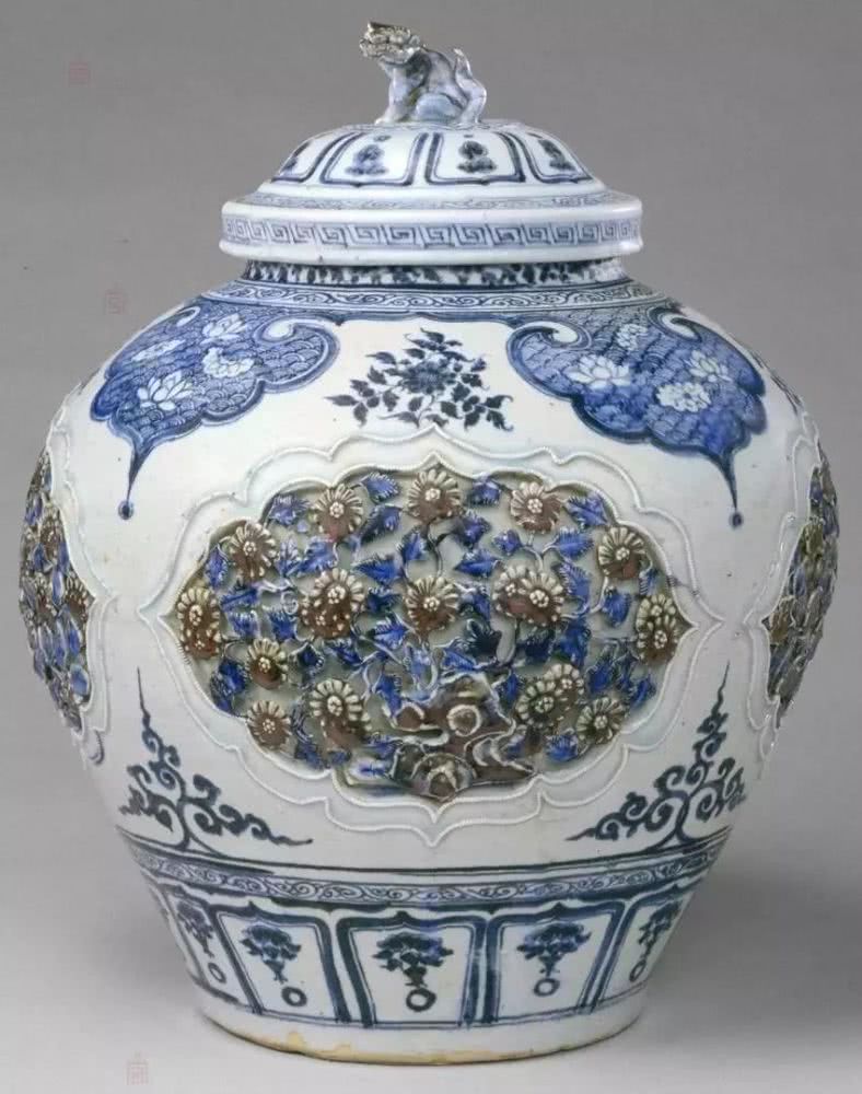 上世纪60年代初,国内专家开始关注元青花,这也正是河北省博物馆现藏青花釉里红盖罐等元青花出土的前后。同时出土六件,不仅器物完整,而且质量也极精致。特别是青花釉里红盖罐更是稀见的文物,造型雄浑,纹饰多样,莹亮的红色与湛蓝的青花交相辉映,集彩绘、镂雕、贴塑、青花、釉里红等多种装饰技法于一身,是元青花中的顶级国宝,素有“青花王”的美誉。青花釉里红盖罐出土了一对,罐盖完整的一件由当时的河北省博物馆收藏,另一件由故宫博物院收藏。