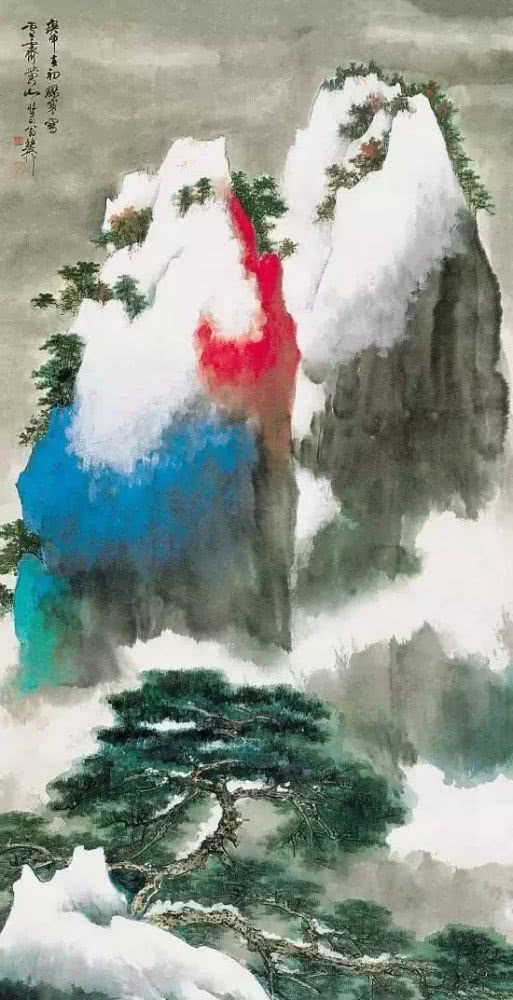 展开这幅谢先生描绘雪霁黄山的画作,最令人惊心动魄的定是落于纸面浓烈的色彩。色彩的表现是客观的,它是光影,原色的再现;色彩也是主观的,它更是画家内心情感的流露与生发。“霁”,雨雪落后初晴也。当阳光照射在覆盖着皑皑白雪的群峰上时,由于阳光的折射与周遭景物的反射所表现出的不正如画中描绘的那样绚烂。石青石绿的温润,洋红的浓烈,加之墨色的浸润,大千世界的玄妙与不可思议被谢先生转化成了可能与美妙。云雾缭绕群峰,愈见壮阔;古松虬曲盘旋更增灵秀之致。绚烂归平淡,不仅仅读到了画中山水间的绚烂,还有谢先生驾驭波澜壮阔的一份淡定与从容。