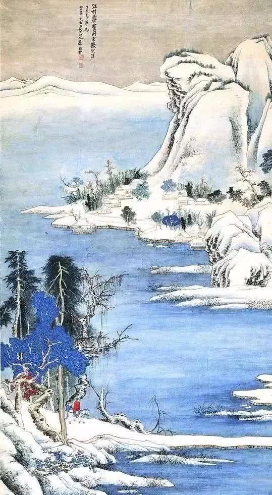 《江村霁雪图》以三段式构图,远景处群山起伏,白雪皑皑,将雪后山川的佳境表现得一览无疑。中段峰峦岩岫拔地耸立,山体奇峰突兀,银装素裹;山头处树木繁丛,绿色荫荫,似乎要在这冰天雪地之间表现其顽强的生命力;山脚下有一村落,村中屋舍也都披上了银装,显得格外清新、舒爽,村中的树木竞相生长,一派枝繁叶茂的景象。近景处为一山坡,坡道两边古树林立,盘曲交错,给人以遒劲挺拔、苍劲古拙之感。又有一红衣老者纵白马于坡上,蓝衣童子紧随其后,望其去处,正是那山脚下的村落,是叶落归根?还是深山访友?绝妙的构局留给人无限的遐思,并使中、近两景遥相呼应,相映成辉,令人不禁拍案叫绝。各景物之间则是大片的湖泊,蔚蓝的湖水反衬着四周的雪景,使天地之间的山水情景得到了完美的平衡。