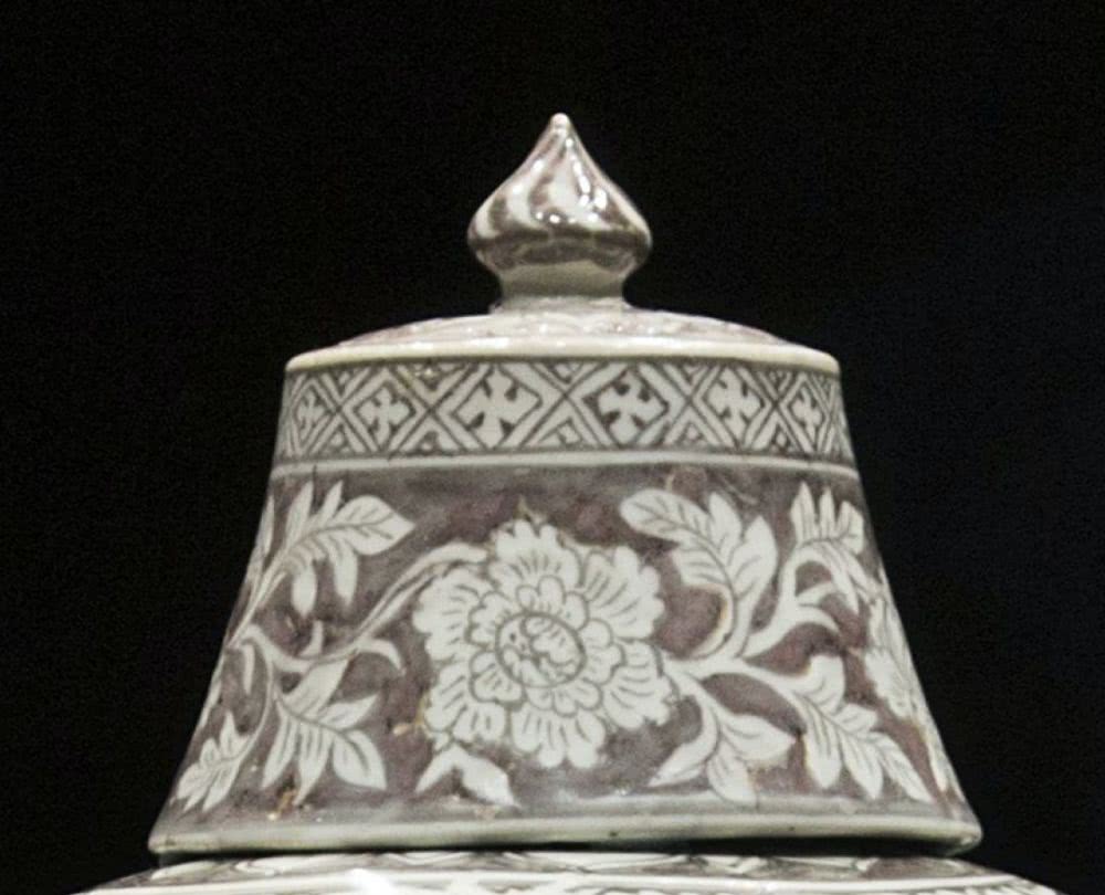 此件梅瓶的盖亦十分特殊,瓶盖腹部以釉里红为底,以白色部分显示为纹饰,烧成后图案花纹即在周围红色之中以胎釉本色显现出来。这样的装饰方法在早期青花瓷器中非常常见——用专用的笔勾勒出纹饰的轮廓,再用青花色料涂满轮廓以外的地子,上透明釉烧成。这一装饰方法在釉里红瓷器上的使用最早见于元代,如北京故宫博物院藏「元釉里红地白花暗刻云龙纹四系扁壶」,明初洪武可见北京故宫博物院藏「明洪武釉里红拔白缠枝花卉纹碗」。这件明洪武釉里红岁寒三友纹梅瓶同时运用釉里红拔白装饰技法与白釉为地的釉里红绘纹饰,极为少见。