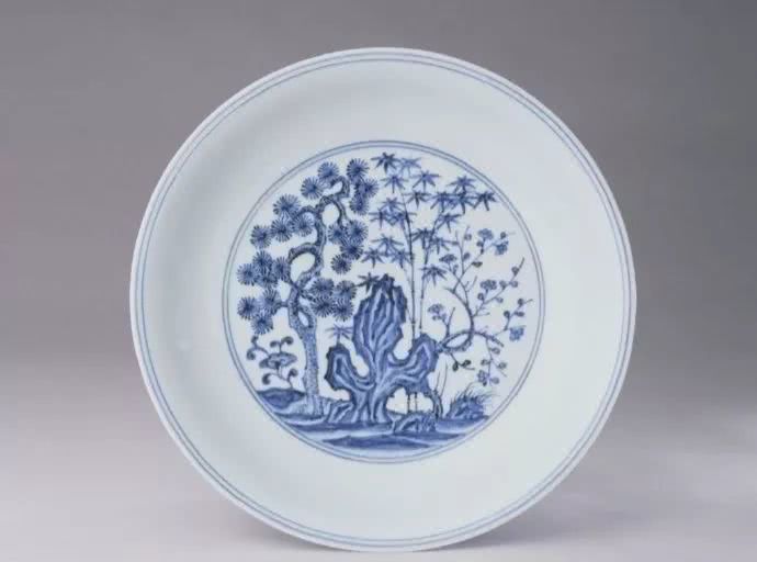 明代瓷绘上松竹梅常与洞石栏杆构成庭园景致,如宣德青花松竹梅纹盘、青花松竹梅纹带盖梅瓶、成化青花松竹梅纹盘等。永宣时期,纹饰虽然出现不少其它创新,但“岁寒三友”并没有被冷落,盘、碗、高足杯等器物都很常见。特别是宣德朝,御厂经常在盘心绘画松竹梅,外壁装饰各类人物。尤以仕女为主,包括秉烛夜游、蕉叶题诗、焚香拜月、仙女乘鹤等,还有不少其他人物典故。这种搭配方式使当时的纹饰种类多样,并进一步推动了“岁寒三友”在明代御厂中的大量应用。