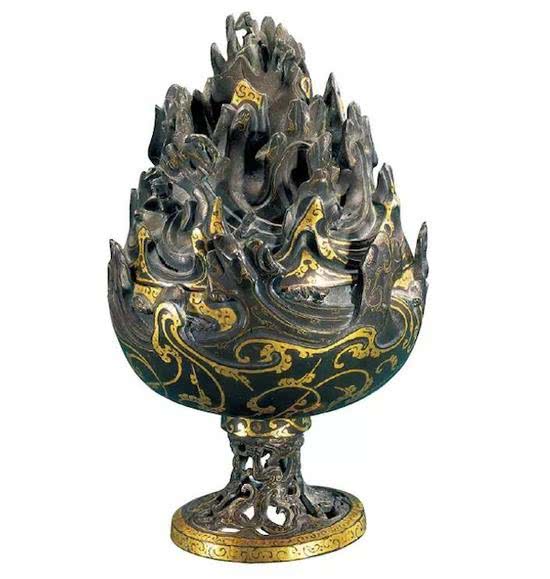 “事死如生”的丧葬制度在两汉极为流行。此次展出的一整套由镶玉漆棺、金缕玉衣、玉枕、敛尸玉璧、玉握、玉塞等共同组成的殓葬用具从物质层面阐释了古人的生死观念。而与之一并展出的“汉错金银博山炉”则反映了当时道教文化的流行。“汉错金银博山炉”1968年出土于满城县陵山中山靖王刘胜墓。博山炉又叫博山香炉,是中国汉、晋时期常见的焚香所用的器具,因像传说中的海上仙山——博山而得名。炉身似豆形,通体用金丝和金片错出舒展的云气纹。炉盘上部和炉盖铸出高低起伏的山峦。炉盖上因山势镂孔,雕塑出生动的山间景色。座把透雕成三龙出水状,以龙头擎托炉盘,是一件举世闻名的珍宝。从工艺上看,炉身的盘和座是分铸后用铁钉铆合,通体错金,表现出当时手工业和工艺美术方面的高度发展水平。