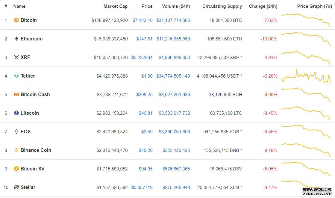 据信息与交易平台CoinMarketCap.com统计,市值排名前十位的数字货币周五集体下跌、惨遭血洗,本周价格全面转负。比特币现金周内领跌,比特币单周跌幅为一年来第二大。