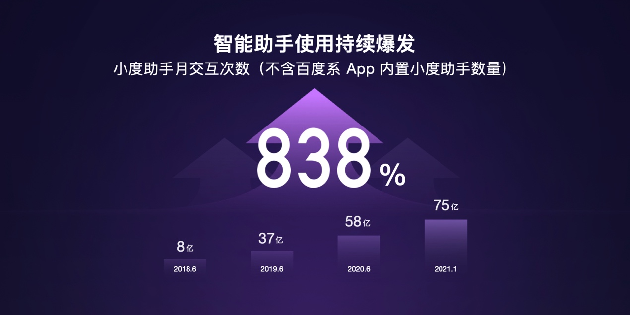 作为全国领先的对话式AI操作系统,小度助手历经三年跨越式发展,使用持续爆发。截至2021年1月,小度助手月交互次数达75亿次(不含百度系App内置小度助手数量),较2018年6月增长838%。小度助手的合作伙伴品牌超过500家,开发者社区拥有开发者超过47000名。