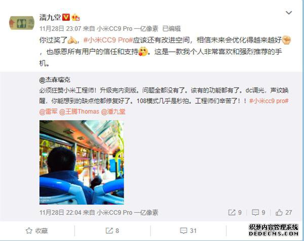 小米产业投资部合伙人潘九堂表示,CC9Pro相信未来会优化得越来越好,这是一款个人非常喜欢和强烈推荐的手机。