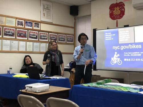 缪昱东(发言者)建议餐馆老板让外卖郎浏览市交通局网站,熟悉纽约市自行车安全法规。(美国《世界日报》/颜洁恩 摄)