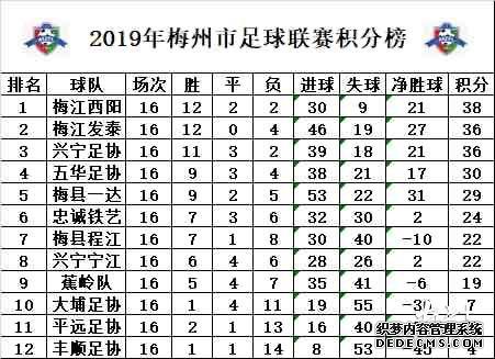 十六轮战罢,梅江西阳仍以38分居榜首,梅江发泰后程发力拿到了36分,以净胜球的优势爬升到第二位,进一步缩小了与榜首的差距,丰顺队虽然客场顽强地逼平了大埔队,但只积四分,继续担任副班长。
