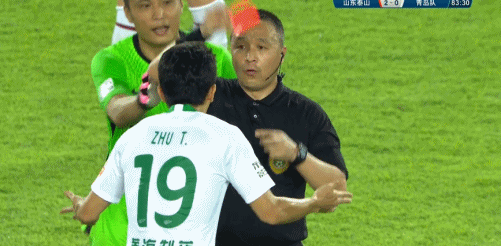 第78分钟,青岛队用老将朱挺换下高翔,意在加强进攻。第84分钟,朱挺在与宋龙的一次争抢头球的过程中,失去了重心之后踩到了宋龙,宋龙向裁判进行投诉。在视频助理裁判的提醒下,主裁判石祯禄观看了动作回放,随后向朱挺出示了一张红牌,朱挺上场仅踢了5分钟就被罚下场!朱挺也是满脸无辜,走下场时也很沮丧。