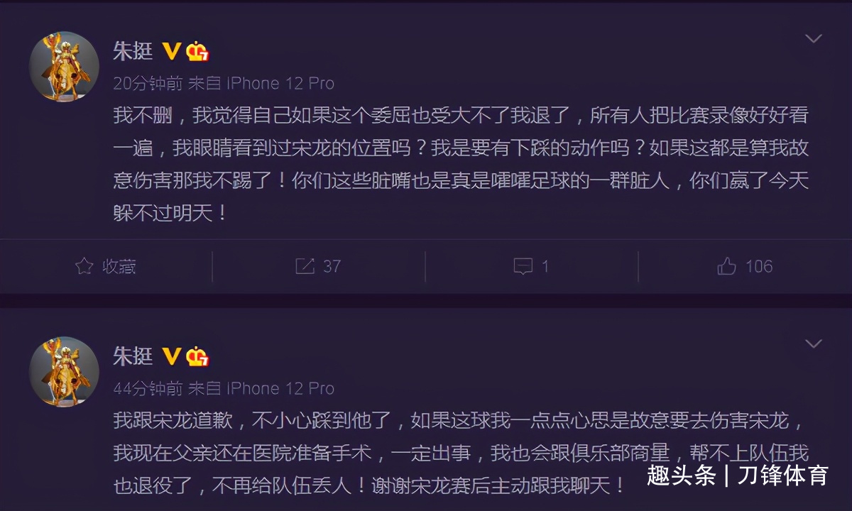 随后,朱挺再次在微博发文,怒怂那些谩骂自己的人,朱挺写道:“我不删,我觉得自己如果这个委屈也受大不了我退了,所有人把比赛录像好好看一遍,我眼睛看到过宋龙的位置吗?我是要有下踩的动作吗?如果这都是算我故意伤害那我不踢了!你们这些脏嘴也是真是嚯嚯足球的一群脏人,你们赢了今天躲不过明天!”