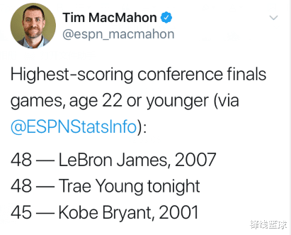 同时,22岁的年龄,也让特雷-杨追平勒布朗-詹姆斯,成为NBA历史22岁及以下在分区决赛得分最多的球员(22岁以下分区决赛得分最多的三名球员分别为:1、詹姆斯48分,2007年;1、特雷-杨48分,2021年;2、科比45分,2001年)。