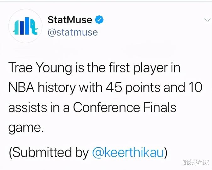 除此之外,特雷-杨本场比赛还拿到了11次助攻,分区决赛砍下至少45分10助攻的两双数据,NBA历史独一份!