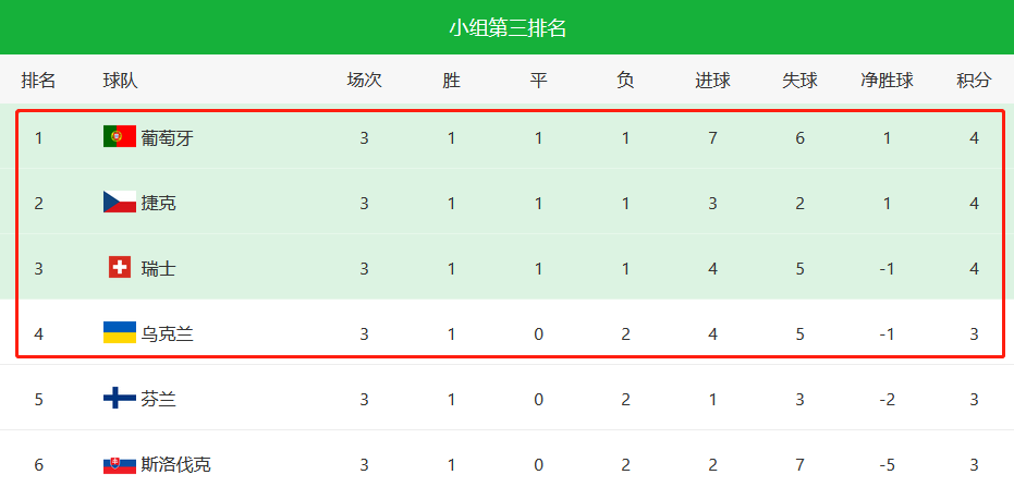 小组第三名积分榜:葡萄牙4分以进球优势成为第一,捷克4分以净胜球优势排名第二,瑞士4分排名第三,世界排名第24的乌克兰3分逆袭以净胜球优势排名第四,惊险晋级16强。芬兰3分排名第5,无缘16强;斯洛伐克3分,因为最后一轮0-5惨败给西班牙,导致净胜球劣势巨大,排名第6直接出局。