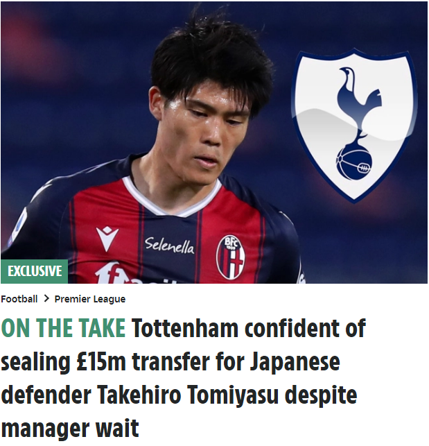 除了亚特兰大之外,英超热刺同样非常中意富安健洋,认为他的加盟可以改善球队的后防线。为了得到富安健洋,热刺开出了1500万英镑的转会费。假如富安健洋加盟,热刺会考虑把多赫蒂和罗登这两名后卫租借去其他球队。