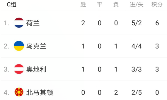 目前乌克兰和奥地利都拿到3分,而且净胜球都是0,其中乌克兰凭借一个进球的优势,暂时排名第二位,假如最后一轮不败,那乌克兰就将拿到小组前两名,直接出线,而奥地利还要看其他小组的结果。