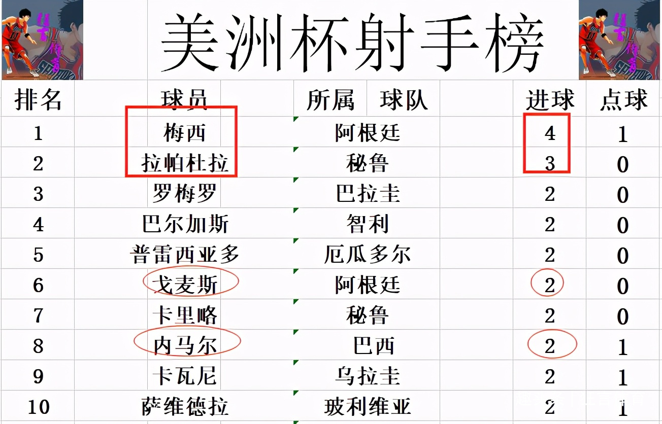 射手榜方面,梅西今天1射2传独造3球,本届美洲杯他已经是打入4球并有4个助攻,一人独造8球,完全撑起阿根廷全队。这样的话梅西也再次超过拉帕杜拉4球独居榜首,拉帕杜拉3球位列第2,内马尔,戈麦斯等8人2球并列第3,还有两场比赛,他们也还有机会追上梅西。