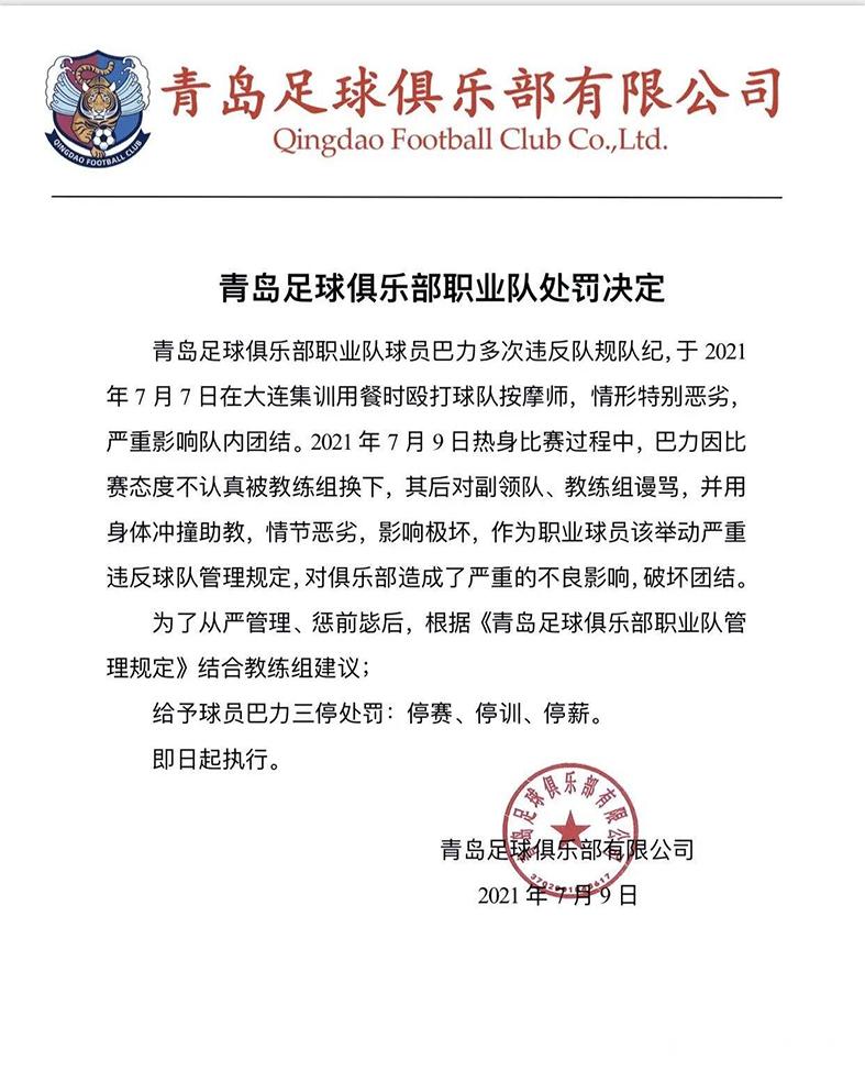 青岛队在大连集训期间,跟上海申花进行了两次交锋,分别以2-3和1-3输球,但教练组也达到了磨合阵容、演练技战术的目的。7月10日,据青岛媒体消息,球员巴力因殴打按摩师被青岛俱乐部三停处罚。据悉,青岛队与上海申花在9日进行的比赛期间,巴力不满教练组换人,对副领队、教练组进行谩骂,并用身体冲撞助教。此前在7月7日,巴力还在集训用餐时,殴打了球队按摩师。对此,俱乐部决定对巴力实行停赛、停训、停薪的“三停”处罚。