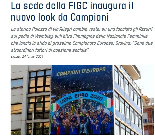 意足协主席格拉维纳表示:“男女国家队都象征着意大利,他们是影响社会凝聚力的两个非凡因素。通过在总部挂起海报这一举措,我们旨在感谢帮助国家队赢下奖杯的球员们,他们总是能为球队注入新的情感,同时我们也要感谢所有意大利球迷对国家队的大力支持。”