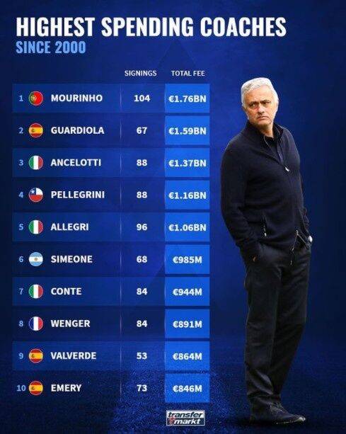 No.1 穆里尼奥(葡萄牙),共计104笔签约,共计17.6亿欧