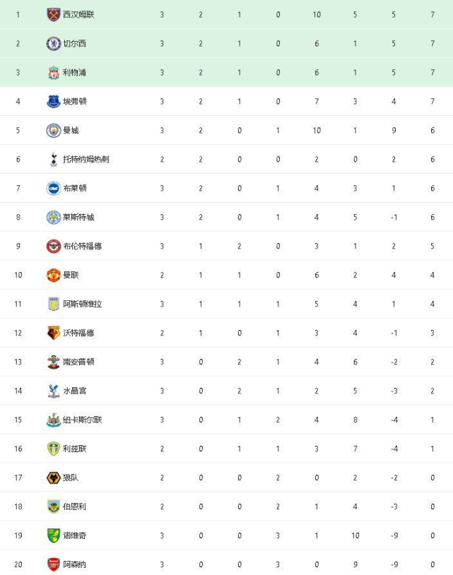 积分榜上,西汉姆、切尔西、利物浦和埃弗顿战绩同为2胜1平,西汉姆暂时以净胜球和进球数领跑,切尔西排在第2位,利物浦和埃弗顿暂列第3和第4位。曼城队2胜1平排名第5位。阿森纳队三连败一球未进净失9球,垫底积分榜。