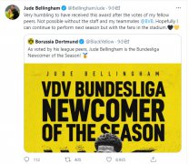 直播吧6月6日讯 多特小将贝林厄姆被德国球员协会选为本赛季德甲最佳新人,贝林厄姆发推谈了获奖感言。 贝林厄姆表示:经过球员们的投票,让我获得了这个奖项,我感到非常荣幸。